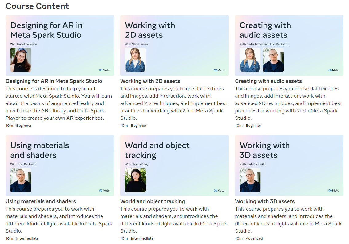 I was the lead producer for the Meta Spark AR Creation Training program in Meta Blueprint. I worked with the subject matter experts to write scripts, create examples and exercises, record screencaptures, and determine graphics for the entire certificate.